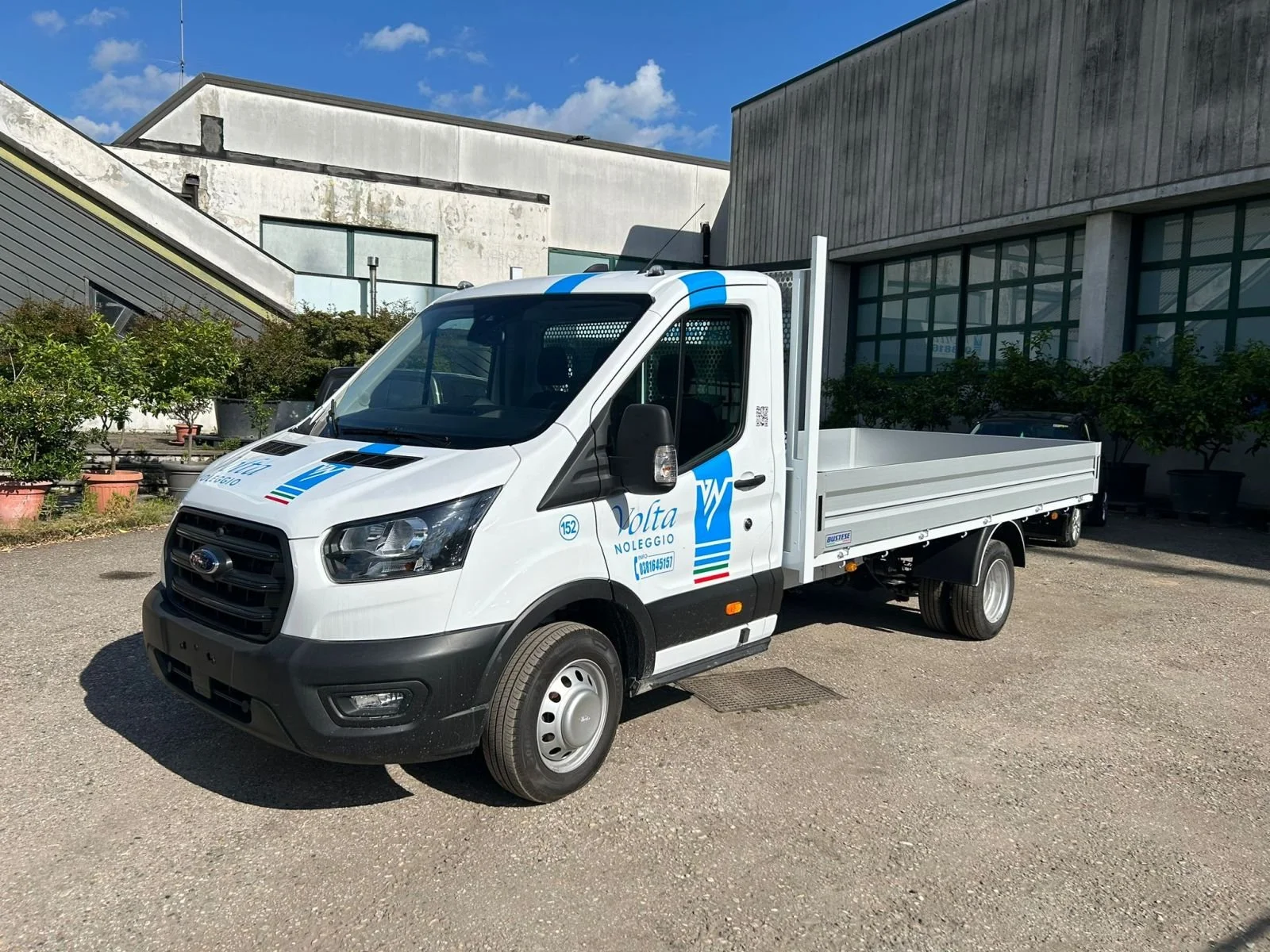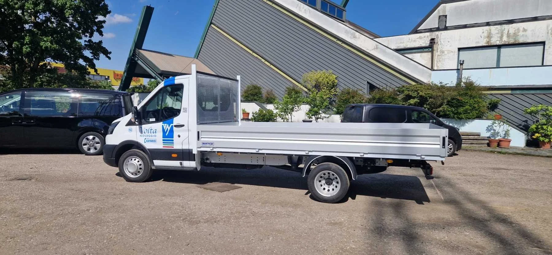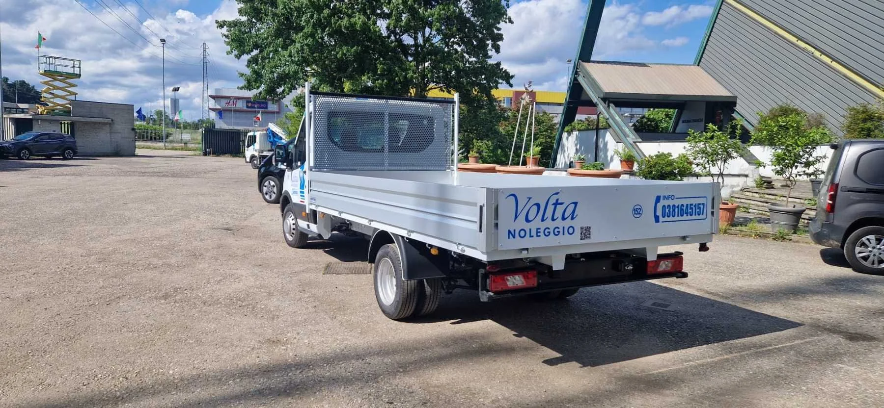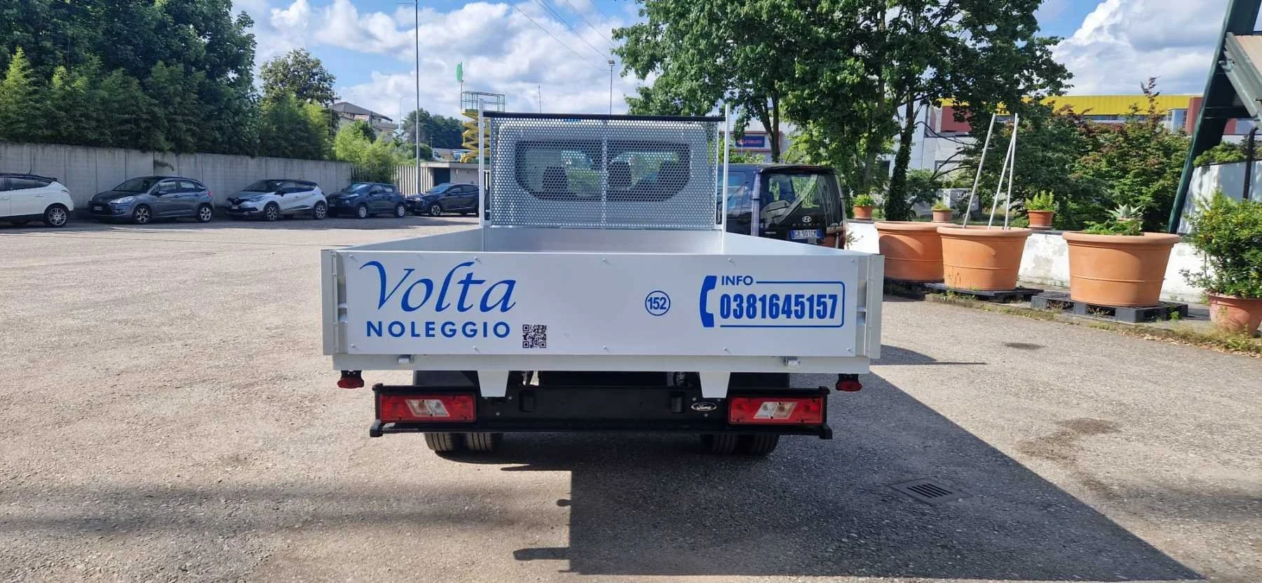 Camion su un piazzale con scritta "Volta Noleggio" sul retro, circondato da alberi e altri veicoli.