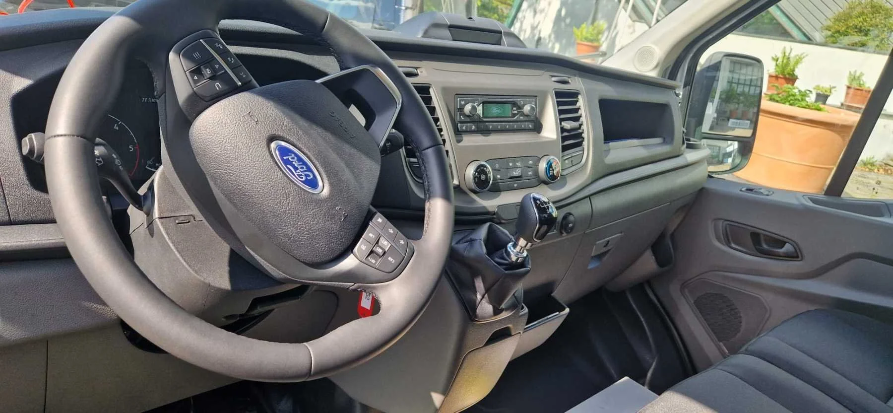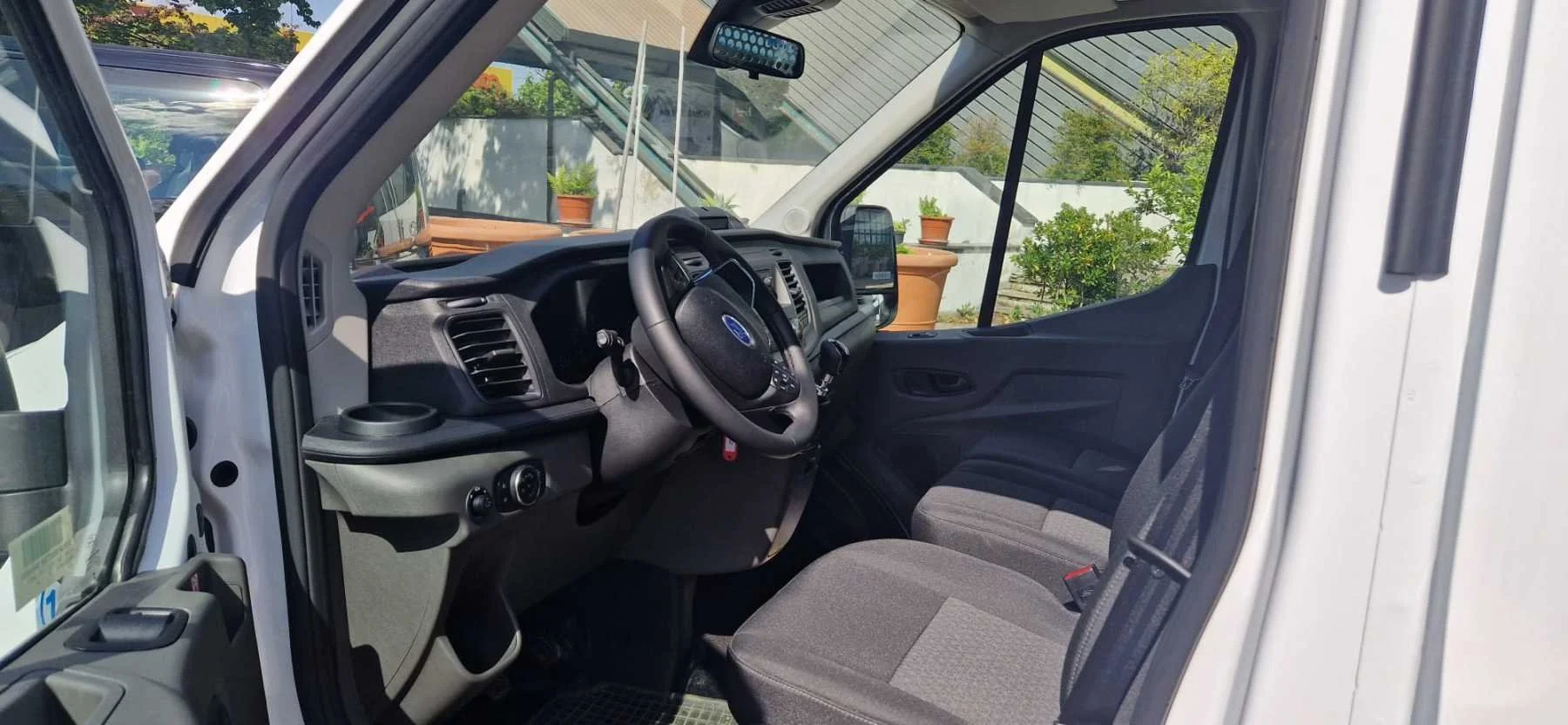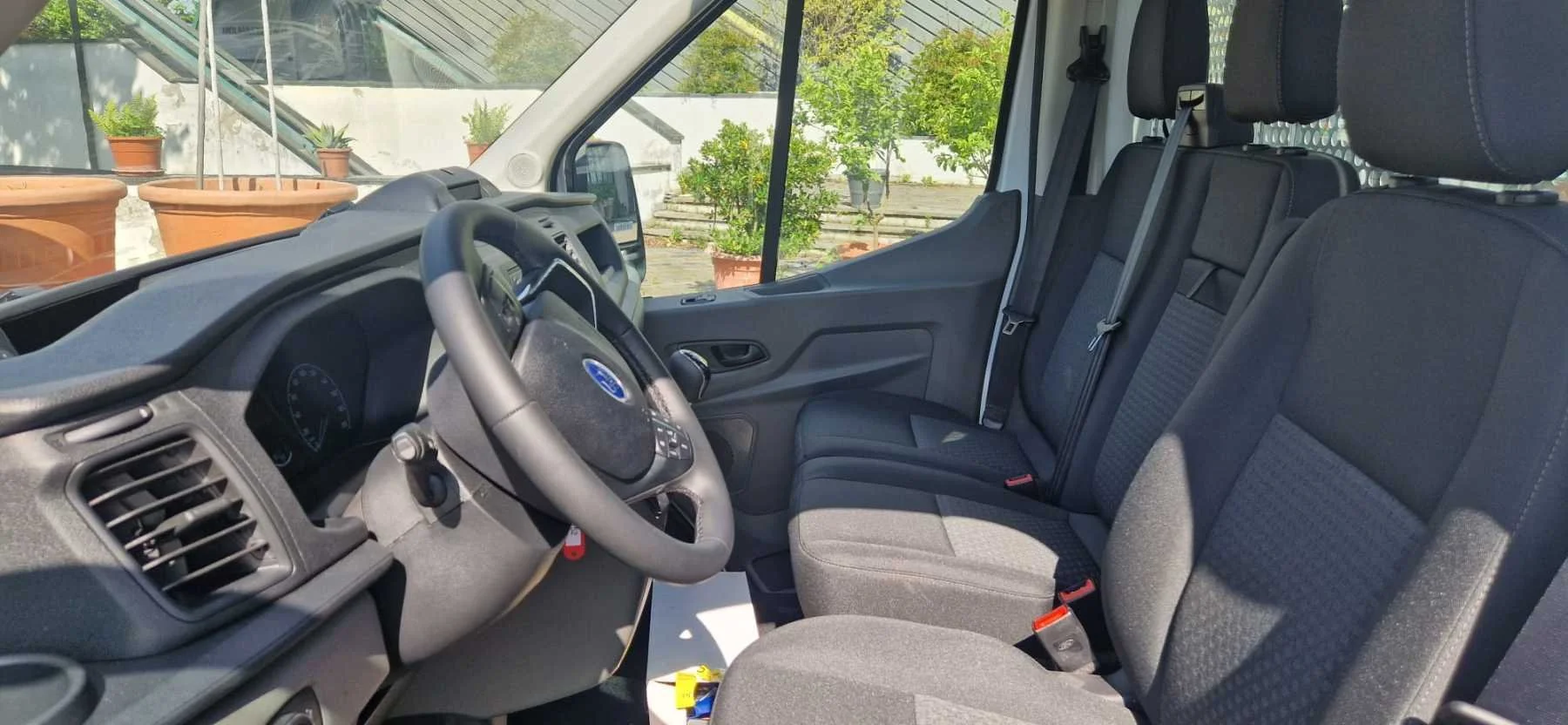 Interno di un furgone con sedili neri e cruscotto visibile. Il volante è sulla sinistra e ci sono finestre laterali con visuale di piante all'esterno.