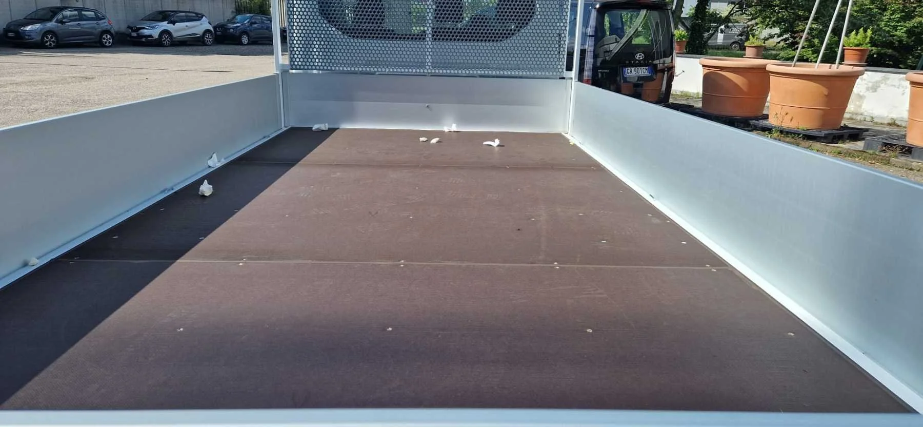 Cassone di un camion vuoto, con fondo marrone e sponde laterali bianche. Ci sono macchine parcheggiate sullo sfondo e vasi grandi sulla destra.